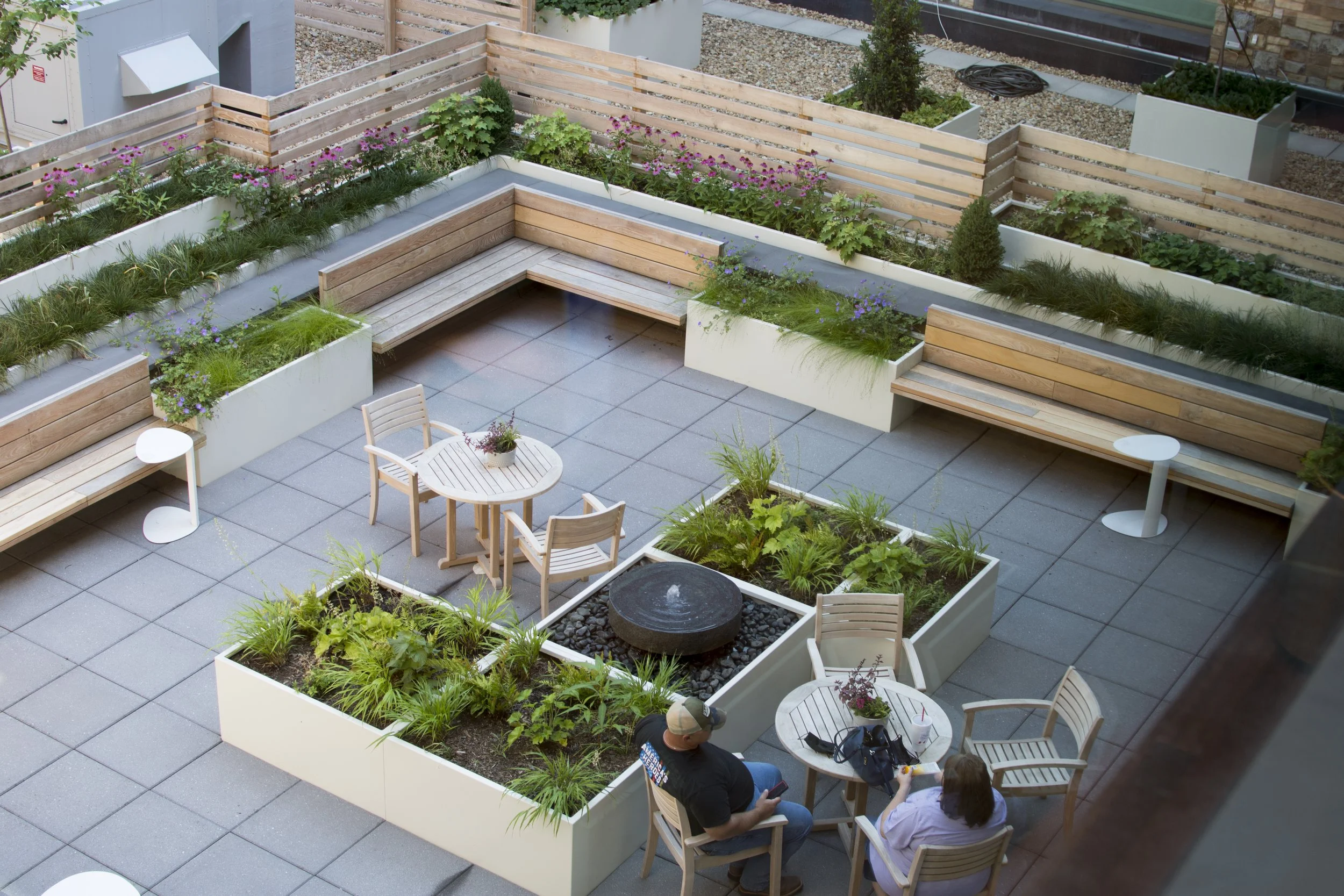 The newly dedicated ‘Serenity Garden’ emphasizes the role of nature – plants, sunlight, water, and fresh air –on the ability to heal. This once inaccessible rooftop courtyard has been transformed into a refuge for staff and patients though a simple palette of modular planters, regional black locust timber, and native trees and perennials. A custom carved stone fountain sits central in the space, serving as a visual and auditory focal point, as well as creating a calm and reflective atmosphere.