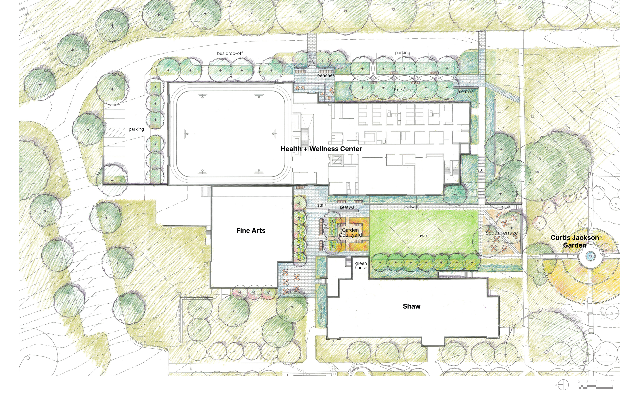 Immediately following the completion of the Master Plan prepared by Wolf Josey, Chatham Hall initiated the first step of a design and fundraising process to replace its existing gym with a new Health and Wellness Center. In January 2020, Wolf Josey and VMDO Architects began the three-month schematic design phase to envision an accessible, flexible, multi-use building and landscape that will promote holistic wellness in the everyday life of students and staff; encourage collaboration between faculty, staff, and students; and create places for community-building, gathering, and play. Through close collaboration with the Chatham Hall Master Planning Committee and the Health and Wellness Task Force, Wolf Josey prepared a landscape design that focused on creating spaces for rest and recharging, informal gathering, and outdoor instruction. A large level lawn provides necessary space for fitness, yoga, and group events. These new spaces are integrated into the existing campus with accessible and unified circulation routes and views overlooking the historic Curtis Jackson Courtyard at the core of campus.