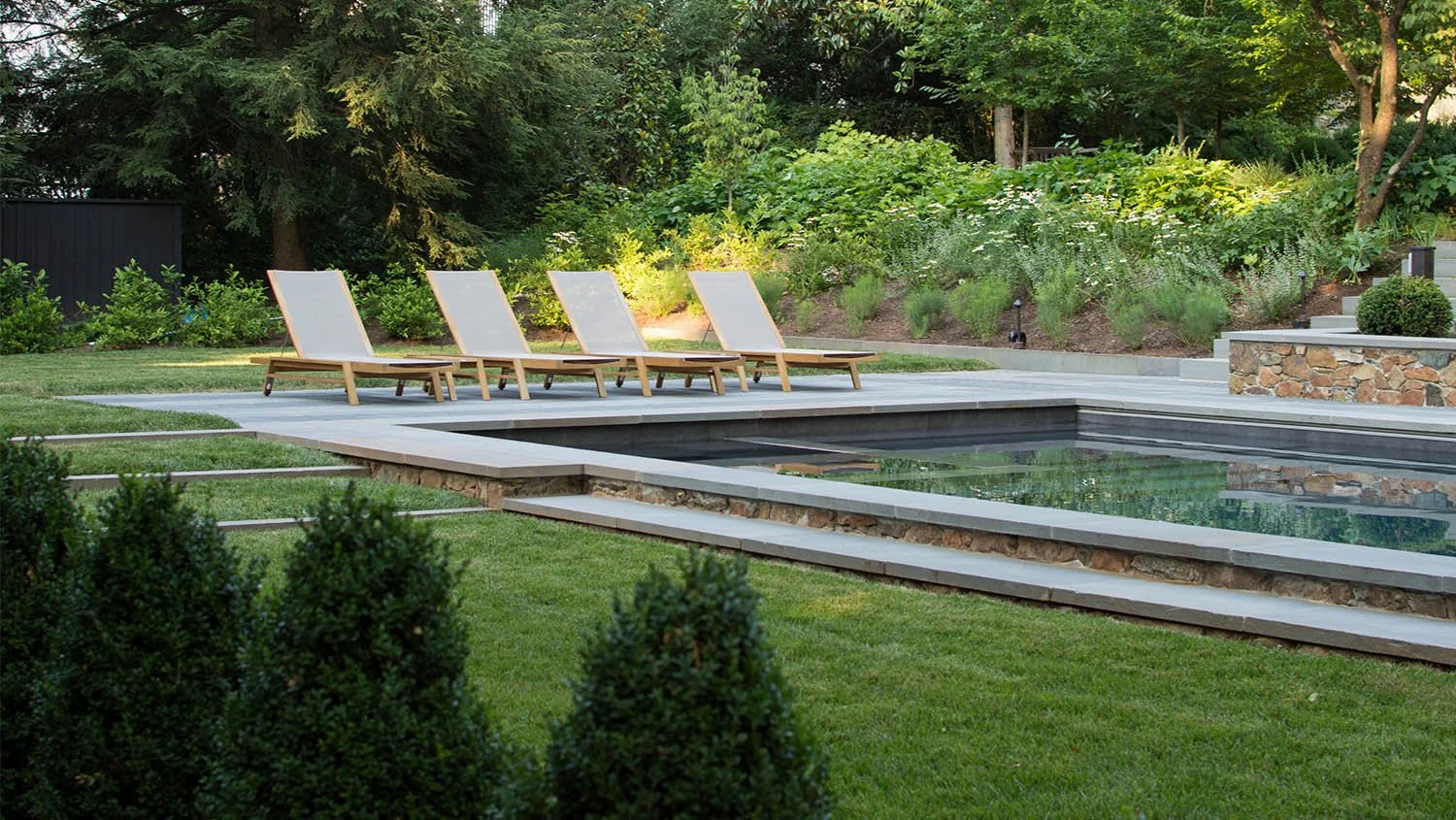 The third terrace, including the lower lawn and pool, was completed under the second owner. The pool was located to center on an existing sugar maple and to avoid its presumed critical root zone. Continuing the terrace concept, the pool is retained on one side by a stone seatwall and steps down to a lower seating lawn. Monumental steps were rebuilt to give a more functional and accessible route to the pool from a side porch, with masonry matching historic site walls. Setting the spa within the pool creates a visually continuous reflection of surrounding trees.