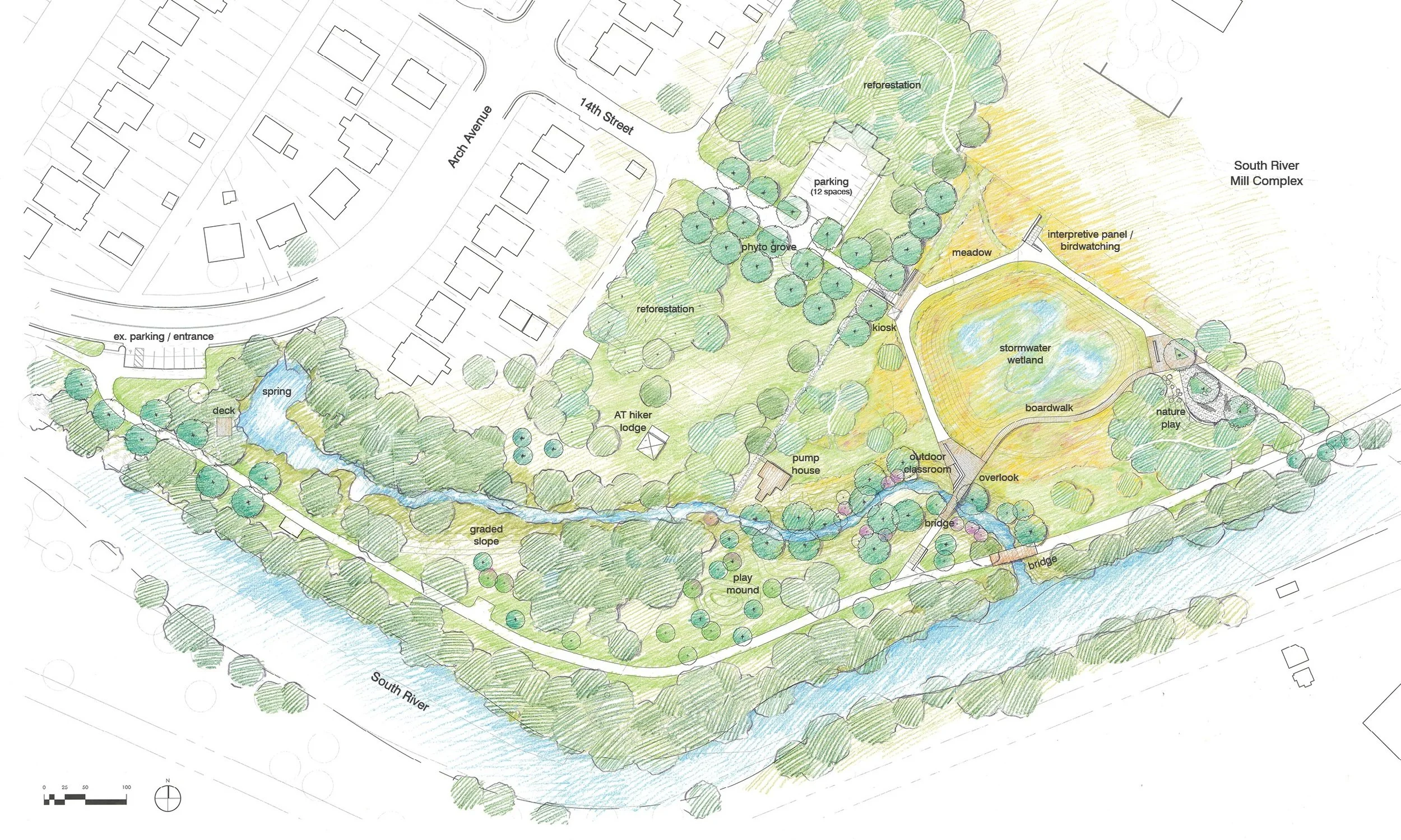 What started as an effort to daylight and restore Loth Spring turned into an ambitious and collaborative endeavor to develop a park along the South River in Waynesboro, Virginia. Our design proposal borrows from the area’s storied past -- as a healing recreation landscape, a corduroy factory, and a wastewater treatment facility -- to create ecological interventions that reveal distinct site histories. The central stormwater basin calls back to the site’s days as a wastewater facility, and the phytoremediation grove was inspired by the texture of corduroy; both capture and clean stormwater. New paths, a boardwalk and overlook, and trout inspired playground are set within a matrix of reforestation and meadow plantings, improving the park for humans and non-humans alike. The proposal reunites the spring and river and improves connections between the public and their local waterways.